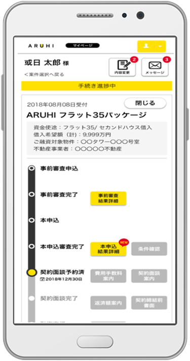 | 「ARUHI navi」の機能について(予定) ① 住宅ローンのお申し込みからご融資実行までの進捗状況を表示 事前審査、本申込、契約面談予約、契約面談完了、融資実行等、現在の進捗状況が分かります。 ② グループメッセージ機能 ARUHIおよびお客さま、お客さまによって招待された不動産事業者、司法書士など※3、住宅ローンのご融資実行に関わる関係者間のやり取りを同時に確認できます。 ③ 各種書類の閲覧機能 ARUHIよりお客さまへご郵送する審査結果、契約手続き案内、費用手数料案内などの文書をWeb上で閲覧できます。 ④ お知らせメール ①から③の更新および契約面談日、融資実行日をお知らせします。 |
